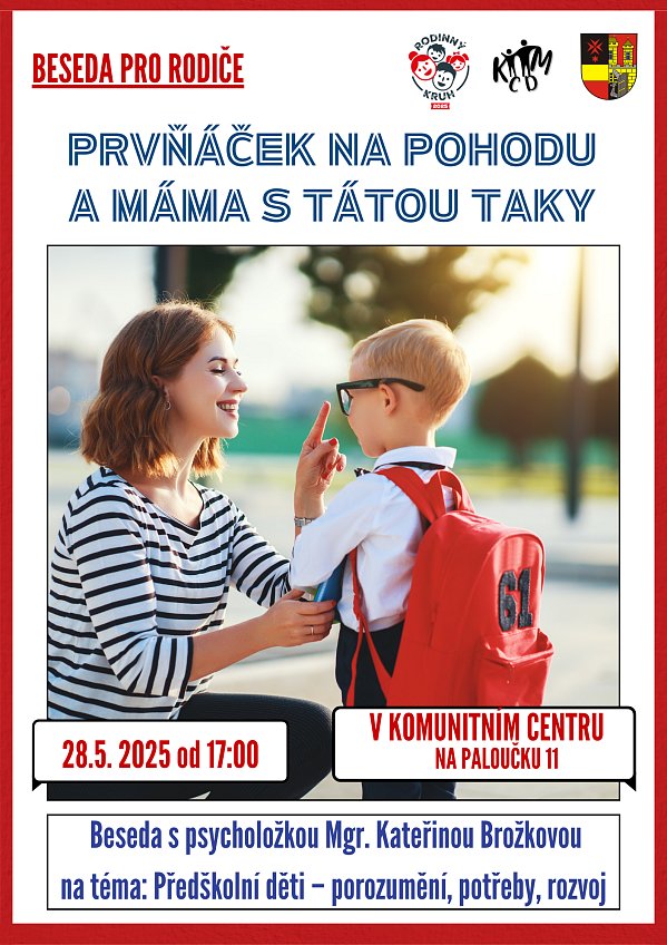 přijměte pozvání na besedu, která nese název "Prvňáček na pohodu a máma s tátou taky." Je určena všem, kteří se brzy chystají projít velkou životní změnou v podobě nástupu dítěte do první třídy.