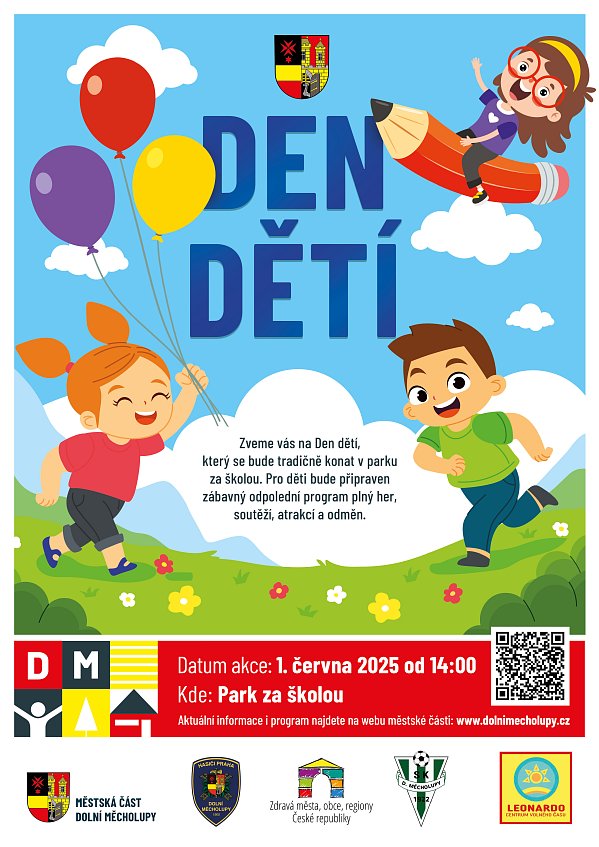 blíží se den, který patří jen a jen dětem – a my ho chceme oslavit s vámi. Připravili jsme pro vás v parku u školy opět zábavné disciplíny, kterými vás provedou naši dobrovolní hasiči, fotbalisti z SK Dolní Měcholupy a také tým z Leonarda. Nové zábavné stanoviště pro nejmenší zajistí adaptační kroužky.